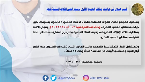 يستضيف المجمع الطبى للقوات المسلحة بالجلاء الأستاذ الدكتور - مالكوم بستونجى خبير جراحة مناظير العمود الفقرى