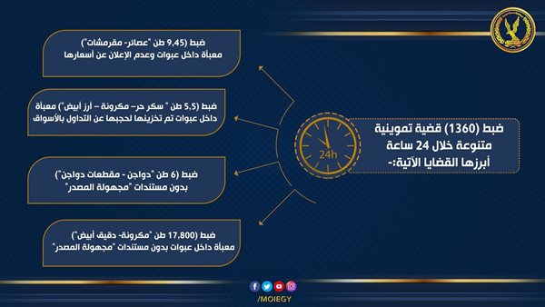 ضبط (1264) قضية تموينية متنوعة من بينهم 4 قضايا حجب سلع غذائية وغير غذائية ومواد بناء بمضبوطات بلغت (10,200 طن دقيق – مسلى – سكر – زيت طعام – 5 طن أسمنت ) ، (337) قضية بيع بأزيد من السعر وعدم الإعلان عن الأسعار بإجمالى مضبوطات بلغت (20 طن أسمنت - 21,290 طن سكر حر - مكرونة – أرز - مسلى - دقيق أبيض-