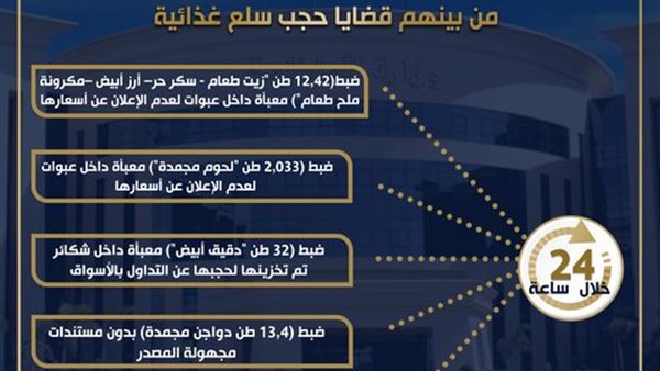 واصلت الإدارة العامة لشرطة التموين والتجارة بالتنسيق مع إدارات وأقسام شرطة التموين وفروعها الجغرافية بمديريات الأمن وقطاع الأمن العام ، حملاتها التموينية المكبرة لضبط الجرائم التموينية. أسفرت عن ضبط 1566 قضية تموينية متنوعة من بينها:- ضبط (3) قضايا حجب سلع إستراتيجية بمضبوطات (37,820 طن "دقيق أبيض -