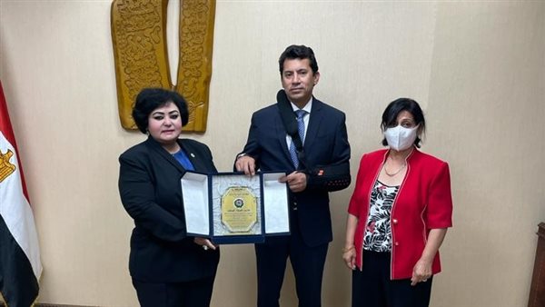 التقي الدكتور أشرف صبحي وزير الشباب والرياضة ورئيس المكتب التنفيذي لمجلس وزراء الشباب والرياضة العرب، الدكتورة مشيرة أبو غالي