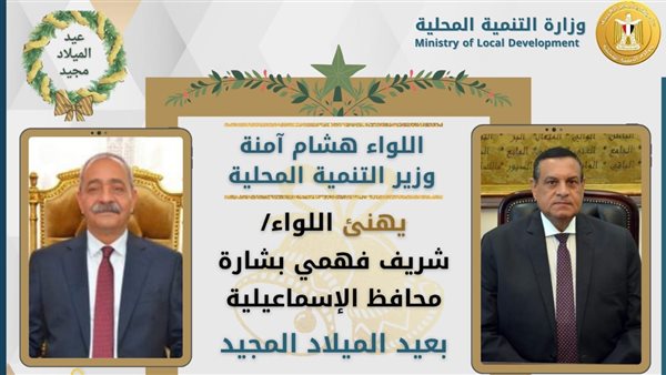 بعث اللواء هشام آمنة وزير التنمية المحلية، برقية تهنئة إلي اللواء شريف فهمي محافظ الإسماعيلية بمناسبة عيد الميلاد المجيد.