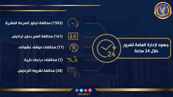 واصلت الإدارة العامة للمرور توجيه الحملات المرورية لتحقيق الإنضباط، وتطبيق قانون ولوائح المرور على قائدى السيارات وضبط المخالفين منهم.. حيث أسفرت جهودها خلال 24 ساعة عن ضبط (5381) مخالفة مرورية متنوعة، من بينها المخالفات التالية: (1485) مخالفة تجاوز السرعة المقررة. (167) مخالفة السير بدون تراخيص. (9)