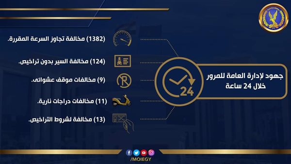 واصلت الإدارة العامة للمرور توجيه الحملات المرورية لتحقيق الإنضباط ، وتطبيق قانون ولوائح المرور على قائدى السيارات وضبط المخالفين منهم.. حيث أسفرت جهودها خلال 24 ساعة