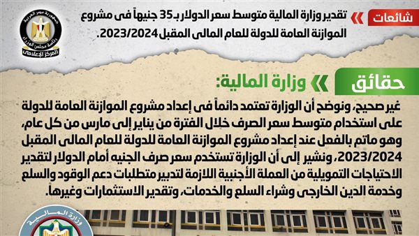 تداولت بعض المواقع الإلكترونية وصفحات التواصل الاجتماعي أنباء بشأن تقدير وزارة المالية متوسط سعر الدولار بـ٣٥ جنيهاً في مشروع الموازنة العامة للدولة للعام المالي