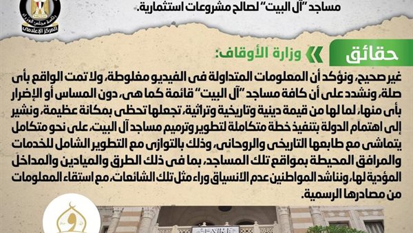 تداولت بعض المواقع الإلكترونية فيديو يزعم اعتزام الحكومة تنفيذ خطة شاملة لهدم وإزالة مساجد "آل البيت" لصالح مشروعات استثمارية، وقد قام المركز الإعلامي لمجلس الوزراء بالتواصل مع وزارة الأوقاف، والتي نفت تلك الأنباء نفياً قاطعاً، مؤكدةً أنه لا صحة لاعتزام الحكومة تنفيذ خطة شاملة لهدم وإزالة أي مسجد من