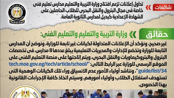 تداولت بعض وسائل الإعلام والمواقع الإلكترونية وصفحات التواصل الاجتماعي إعلانات تزعم افتتاح وزارة التربية والتعليم مدارس تعليم فني خاصة