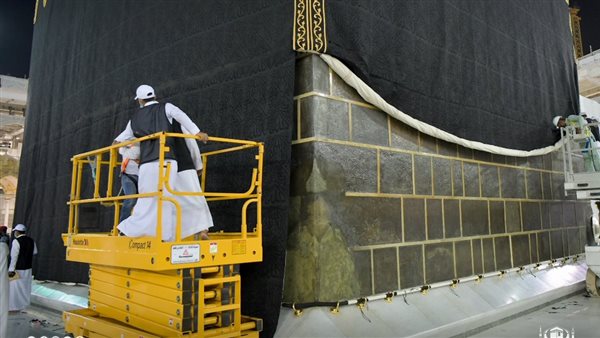 بالصور..33 مختصاً يقومون بإسدال ثوب الكعبة المشرفة