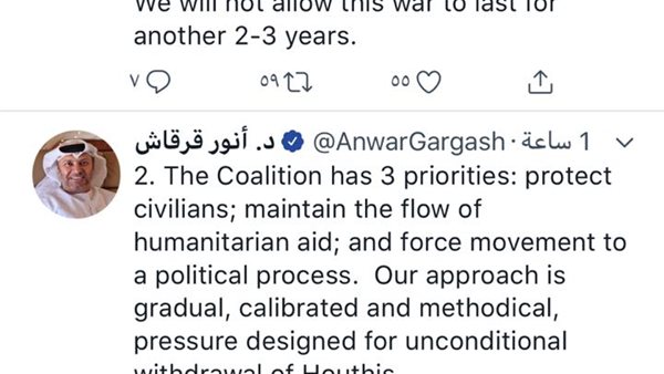 أنور قرقاش: لن نسمح بإطالة أمد الحرب في إليمن.. ولن نمنح الحوثيين نصف البلاد