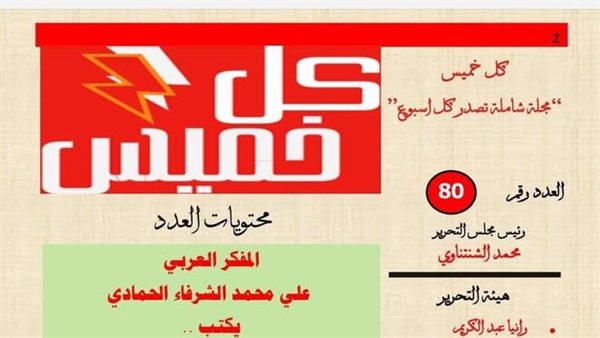 صدر اليوم الخميس 10 يوليو 2025، العدد الجديد " رقم 80 " من مجلة " كل خميس " والصادرة عن مؤسسة رسالة السلام بالقاهرة ، متضمنًا محتوى فكرياً ثرياً يتناول قضايا دينية واجتماعية من منظور تجديدي . وقد تصدّر غلاف العدد مقالٌ تحليلي مهم للمفكر العربي الكبير عل الشرفاء الحمادي، بعنوان : " الزكاة مدخل آمن