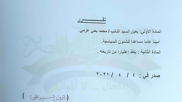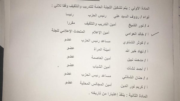 تشكيل اللجنة العامة للتدريب والتثقيف بحزب الحركة الوطنية المصرية