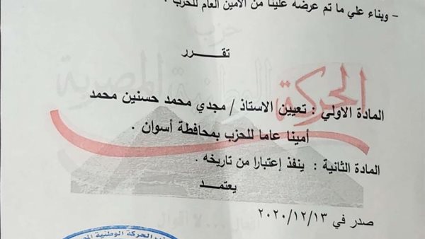 الحركة الوطنية يناقش دور الرقابة الشعبية علي السلطة التنفيذية خلال البرنامج التدريبي لتاهيل الشباب 17/12/2020 09:27 م