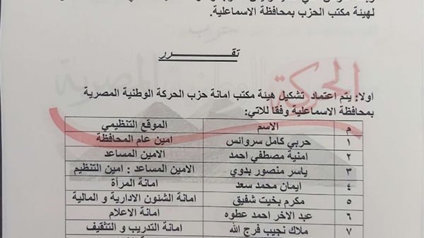 أمين عام الحركة الوطنية يصدر ٣ قرارات بالموافقة على تشكيلات هيئة مكتب الحزب بثلاث محافظات 06/12/2020 06:50 م