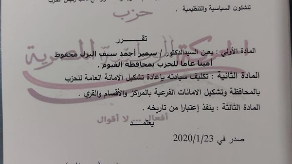 محافظ بني سويف الأسبق .. أمينا عاما لحزب الحركة الوطنية بالفيوم