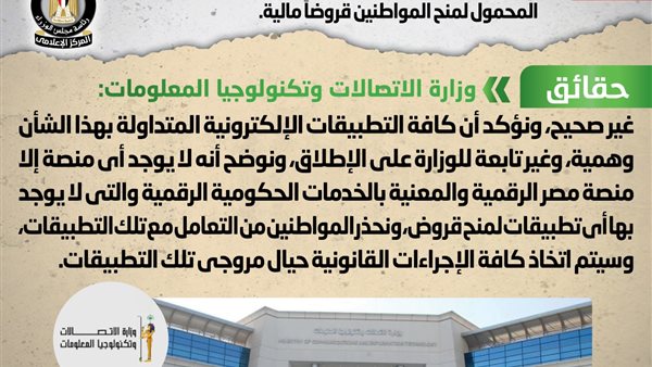 كشف المركز الإعلامى لمجلس الوزراء، إنه فى ضوء ما تردد من أنباء بشأن إطلاق وزارة الاتصالات تطبيقات إلكترونية على الهاتف المحمول لمنح المواطنين قروضاً مالية، تواصل المركز مع وزارة الاتصالات وتكنولوجيا المعلومات، والتي نفت تلك الأنباء. وأكدت الصحة أنه لا صحة لإطلاق الوزارة أى تطبيقات إلكترونية على الهاتف