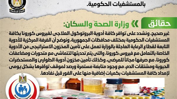 تداولت بعض المواقع الإلكترونية وصفحات التواصل الاجتماعي أنباء بشأن نقص أدوية بروتوكولات علاج فيروس كورونا بالمستشفيات الحكومية، وقد قام المركز الإعلامي لمجلس الوزراء بالتواصل مع وزارة الصحة والسكان، والتي نفت تلك الأنباء، مُؤكدةً أنه لا صحة لنقص أدوية بروتوكولات علاج فيروس كورونا بالمستشفيات الحكومية،