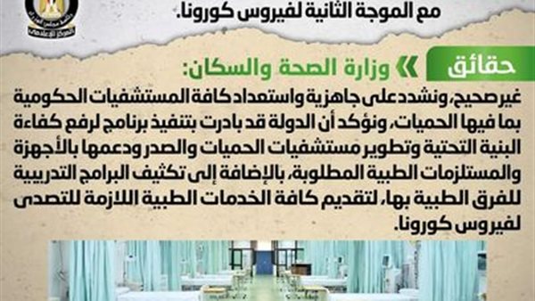 تعرف على حقيقة عدم جاهزية مستشفيات الحميات تزامنًا مع الموجة الثانية لفيروس كورونا 25/11/2020 05:00 م