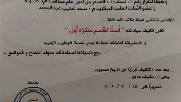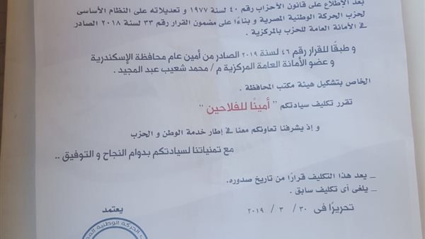الحركة الوطنية بالاسكندرية : تعيين عامر اميناً للحزب لقسم منتزة اول وعبد الكريم لمنتزة ثاني وعاشور اميناً للتنظيم 01/04/2019 09:11 م