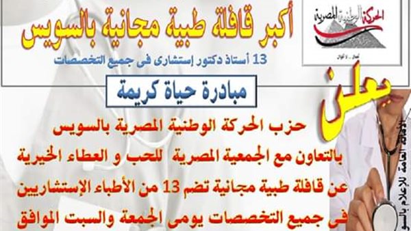 غدا .. "الحركة الوطنية"يطلق اكبر قافلة طبية ضمن "حياة كريمة"بالسويس