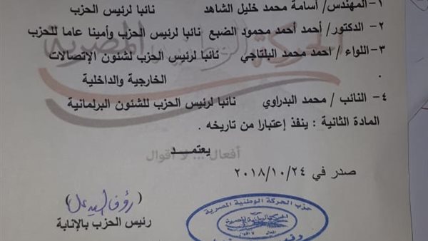 الحركة الوطنية تؤجل المؤتمر الصحفي المقرر عقده الأحد.. وتكتفي بالمؤتمر العام لإختيار رئيس جديد للحزب 30/10/2018 03:11 م
