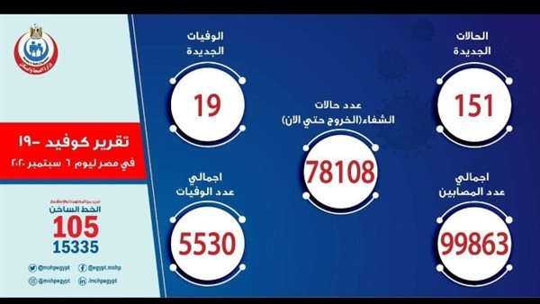 151 حالة إيجابية جديدة لفيروس كورونا.. و 19 حالة وفاة حصيلة فيروس كورونا اليوم فى مصر 07/09/2020 12:04 ص