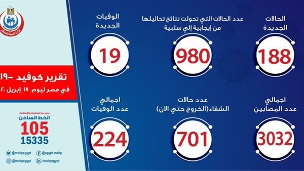 ارتفاع فى اعداد الاصابات والوفيات.. الصحة تسجيل 188 حالة إيجابية جديدة لفيروس كورونا و19 حالة وفاة في يوم واحد 18/04/2020 07:29 م