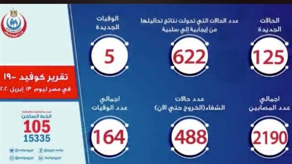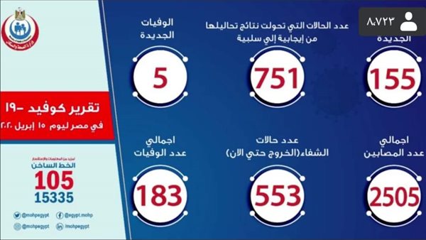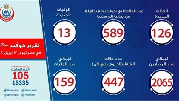 تعدي حاجز الـ 2000 إصابة| وزارة الصحة تعلن عدد الحالات الجديدة المصابة بفيروس كورونا 12/04/2020 09:39 م