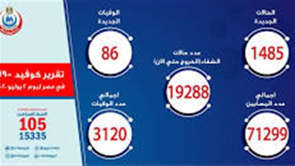إصابات ووفيات كورونا «كوفيد-19» في مصر اليوم الخميس 2 يوليو| 1485 حالات إيجابية جديدة لفيروس كورونا.. و86 حالة وفاة 02/07/2020 09:46 م