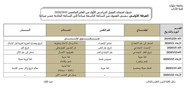 جداول الامتحانات بكليه الأداب جامعة حلوان