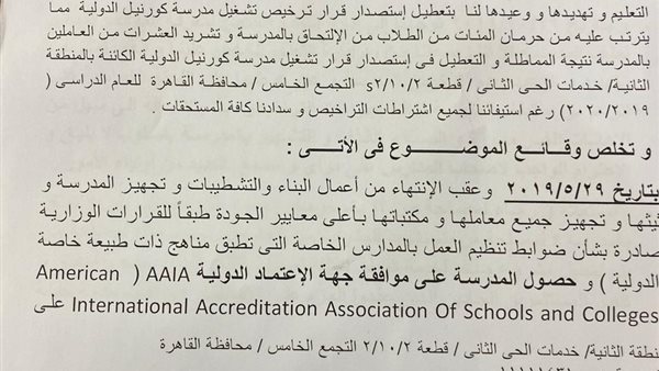 التعليم ترفض ترخيص مدرسة دولية بعد شهر من بدء الدراسة.. وأولياء الأمور: حرام عليكم مستقبل ولادنا هيضيع 06/11/2019 11:23 ص