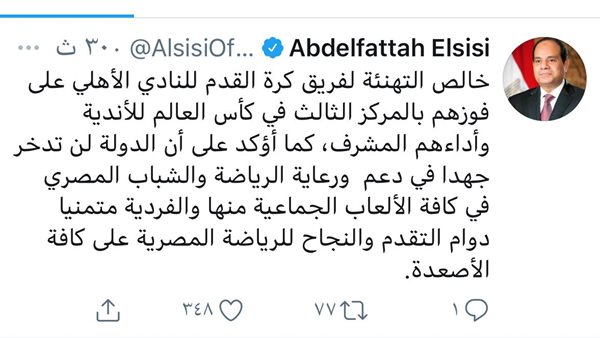 " رئيس لجنة السياحة والطيران بالنواب " تهنئ النادى الأهلى ببرونزية كأس العالم للأندية 11/02/2021 09:10 م