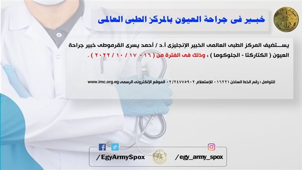 يستضيف المركز الطبى العالمى، الخبير الإنجليزى الدكتور أحمد يسرى القرموطى خبير جراحة العيون (الكتاركتا - الجلوكوما)، وذلك يومى 16 و17 اكتوبر الجارى.
