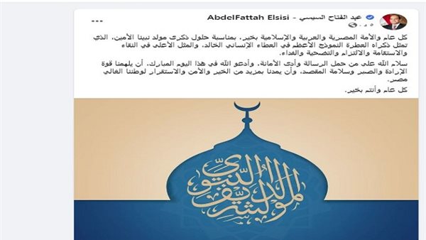 السيسي يهنئ الشعب المصري والأمة العربية والإسلامية بذكرى المولد النبوي الشريف