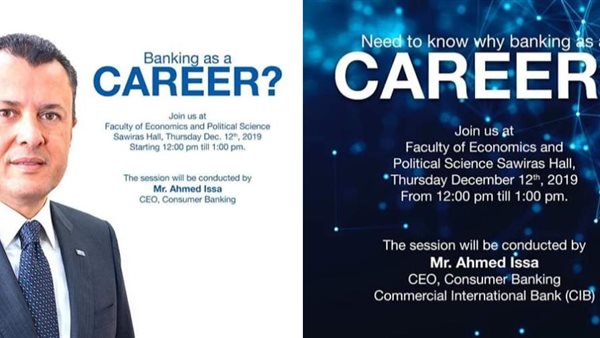 غدًا..ندوة تعريفية بمجال الBanking علي هامش ملتقي التوظيف بكلية الاقتصاد والعلوم السياسية القاهرة 11/12/2019 08:05 م