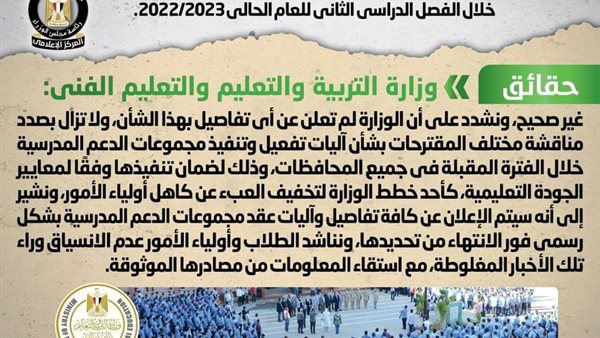 انتشر في بعض المواقع الإلكترونية وصفحات التواصل الاجتماعي أنباء بشأن تداول قائمة بأسعار حصص مجموعات الدعم المدرسية للطلاب خلال الفصل الدراسي الثاني للعام الحالي 2022/2023، وقد قام المركز الإعلامي لمجلس الوزراء بالتواصل مع وزارة التربية والتعليم والتعليم الفني، والتي نفت تلك الأنباء، مُؤكدةً أنه لا صحة