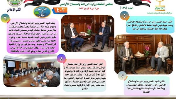 أصدر مركز المعلومات الصوتية والمرئية، التابع لوزارة الزراعة واستصلاح الأراضي، "الانفوجراف الأسبوعي" في نسخته رقم ١٢٩ ، حول الحصاد الأسبوعي لأهم أنشطة الوزارة، خلال الأسبوع الماضي في الفترة من ٣ وحتى ٩ فبراير الجاري، وذلك بالتعاون مع المكتب الإعلامي للوزارة، كما أصدر المركز أيضا ملخصا بالفيديو، حول أنشطة