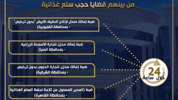 واصلت الإدارة العامة لشرطة التموين والتجارة بالتنسيق مع إدارات وأقسام شرطة التموين وفروعها الجغرافية بمديريات الأمن وقطاع الأمن العام ، حملاتها التموينية المكبرة لضبط الجرائم التموينية أسفرت عن ضبط عدد 2088 قضية تموينية متنوعة من بينها :- ضبط (9) قضية حجب "أرز أبيض" بمضبوطات بلغت (32,870 طن أرز أبيض