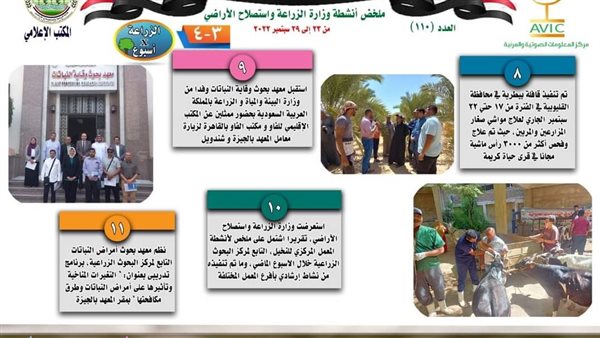 أصدر مركز المعلومات الصوتية والمرئية، التابع لوزارة الزراعة واستصلاح الأراضي، "الانفوجراف الأسبوعي" في نسخته رقم ١١٠ ، حول الحصاد الأسبوعي لأهم أنشطة الوزارة، خلال الأسبوع الماضي في الفترة من ٢٣ إلى ٢٩ سبتمبر الجاري، وذلك بالتعاون مع المكتب الإعلامي للوزارة، كما أصدر المركز أيضا ملخصا بالفيديو، حول