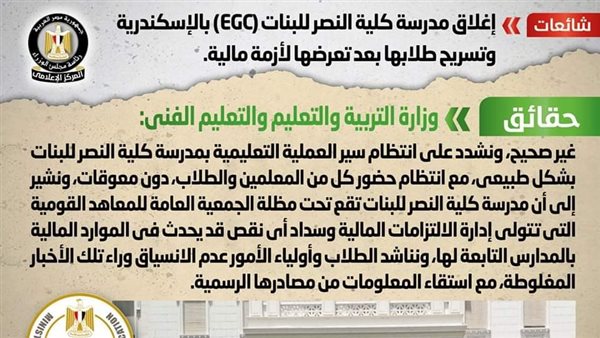 تداولت بعض المواقع الإلكترونية وصفحات التواصل الاجتماعي أنباء بشأن إغلاق مدرسة كلية النصر للبنات (EGC) بالإسكندرية وتسريح طلابها بعد تعرضها لأزمة مالية