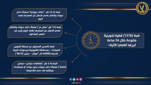 ضبط عدد 1570 قضية تموينية متنوعة من بينهم (424) قضية بيع بأزيد من السعر وعدم الإعلان عن الأسعار سلع غذائية وغير غذائية مضبوطات بلغت (62٫500 طن "دقيق أبيض – مكرونة - سكر – مسلى – أعلاف" – 4700 عبوة "عصائر – ملح طعام" –74 عبوة سجائر)، وكذا (726) قضية فى مجال مخالفات المخابز عبارة عن (26 قضية دقيق مدعم