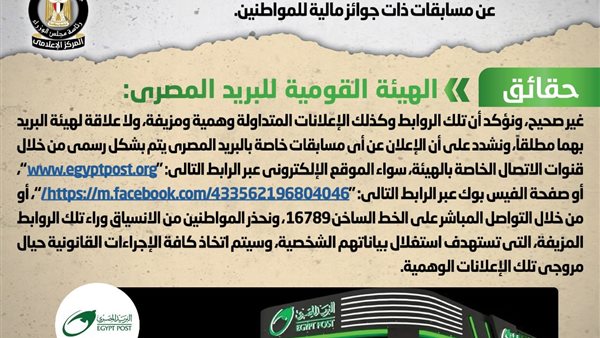 تداولت بعض المواقع الإلكترونية وصفحات التواصل الاجتماعي روابط إلكترونية منسوبة لهيئة البريد المصري بزعم الإعلان عن مسابقات
