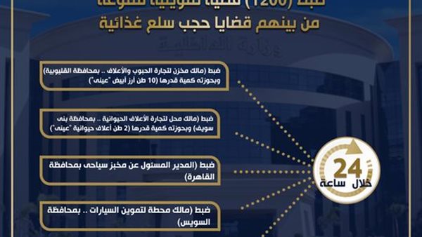 واصلت الإدارة العامة لشرطة التموين والتجارة بالتنسيق مع إدارات وأقسام شرطة التموين وفروعها الجغرافية بمديريات الأمن وقطاع الأمن العام والإدارة العامة لشرطة البيئة والمسطحات ، حملاتها التموينية المكبرة لضبط الجرائم التموينية أسفرت عن ضبط عدد 1200 قضية تموينية متنوعة من بينها :- ▪️ ضبط قضية حجب "أرز أبيض"