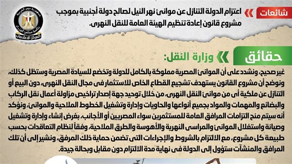 انتشر في بعض المواقع الإلكترونية وصفحات التواصل الاجتماعي أنباء بشأن اعتزام الدولة التنازل عن موانئ نهر النيل لصالح دولة أجنبية