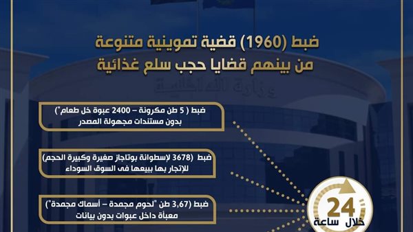 واصلت الإدارة العامة لشرطة التموين والتجارة بالتنسيق مع إدارات وأقسام شرطة التموين وفروعها الجغرافية بمديريات الأمن وقطاع الأمن العام ، حملاتها التموينية المكبرة لضبط الجرائم التموينية أسفرت عن ضبط عدد 1960 قضية تموينية متنوعة من بينها :- ▪️ ضبط (1) قضية حجب "أرز أبيض" بمضبوطات بلغت (9,800 طن أرز أبيض