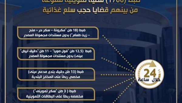 واصلت الإدارة العامة لشرطة التموين والتجارة بالتنسيق مع إدارات وأقسام شرطة التموين وفروعها الجغرافية بمديريات الأمن وقطاع الأمن العام ، حملاتها التموينية المكبرة لضبط الجرائم التموينية أسفرت عن ضبط عدد 1766 قضية تموينية متنوعة من بينها :- ▪️ ضبط (7) قضايا بيع بأزيد " أرز أبيض" بمضبوطات بلغت (8,025