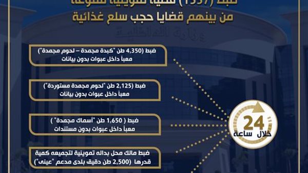 واصلت الإدارة العامة لشرطة التموين والتجارة بالتنسيق مع إدارات وأقسام شرطة التموين وفروعها الجغرافية بمديريات الأمن وقطاع الأمن العام ، حملاتها التموينية المكبرة لضبط الجرائم التموينية أسفرت عن ضبط 1557 قضية تموينية متنوعة من بينها :- ▪️ ضبط (4) قضايا فى مجال حجب السلع الإستراتيجية بمضبوطات بلغت (12,805