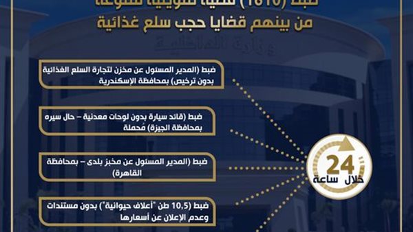 واصلت الإدارة العامة لشرطة التموين والتجارة بالتنسيق مع إدارات وأقسام شرطة التموين وفروعها الجغرافية بمديريات الأمن وقطاع الأمن العام ، حملاتها التموينية المكبرة لضبط الجرائم التموينية أسفرت عن ضبط 1610 قضية تموينية متنوعة من بينها :- ▪️ ضبط (2) قضية حجب سلع إستراتيجية بمضبوطات ( 2,950 طن "أرز أبيض")