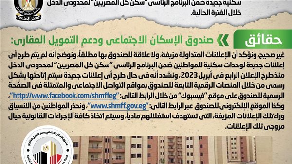 تداول إعلانات منسوبة لصندوق الإسكان الاجتماعي تزعم طرح وحدات سكنية جديدة ضمن البرنامج الرئاسي "سكن كل المصريين" لمحدودي الدخل خلال الفترة الحالية تداولت بعض المواقع الإلكترونية وصفحات التواصل الاجتماعي معلومات بشأن تداول إعلانات منسوبة لصندوق الإسكان الاجتماعي تزعم طرح وحدات سكنية جديدة ضمن البرنامج