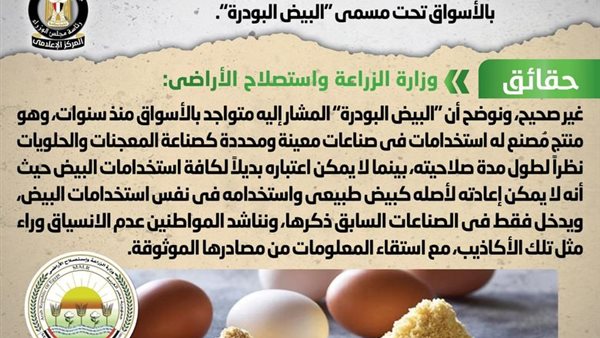 تداولت بعض المواقع الإلكترونية وصفحات التواصل الاجتماعي أنباء بشأن طرح الحكومة لمنتجات بديلة لبيض المائدة الطبيعي بالأسواق تحت مسمى "البيض البودرة"، وقد قام المركز الإعلامي لمجلس الوزراء بالتواصل مع وزارة الزراعة واستصلاح الأراضي، والتي نفت تلك الأنباء مُؤكدةً أنه لا صحة لطرح الحكومة لمنتجات بديلة لبيض